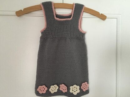 Anleitung für ein niedliches Strickkleid in zwei Größen mit Häkelblüten. Je nach Größe braucht ihr 150 g - 200 g graue Wolle und Reste in weiß und rosa.