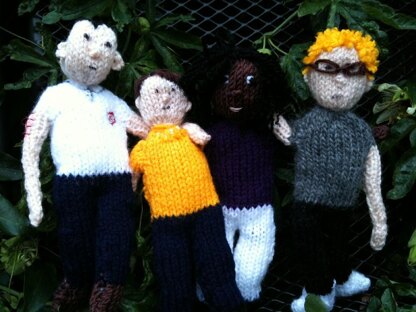 The pattern requires 4mm (US size 6) needles and small amounts (less than 5g) of each of the five different colours required (flesh coloured wool and different colours for shoes, trousers, top and hair), and a small amount of stuffing. Felt tips (optional)