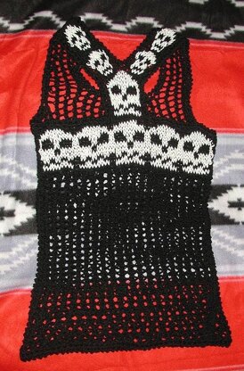 Racer Back Tank knit in an easy 2 row lace patten. There is a graph provided for the skulls. Directions include an all stockinet version Finished measurements XS 34 inch bust. S 36 inch bust M 38 inch chest. L 40 inch bust XL 42 inch bust