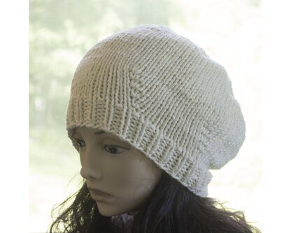 A thick cotton slouch hat, modern and warm to wear. It's knit in a soft cotton yarn. The pattern includes instructions for small, medium and large sizes. Unisex. This is a simple hat that works up quickly. It is an easy pattern for those who are new to knitting in the round.
