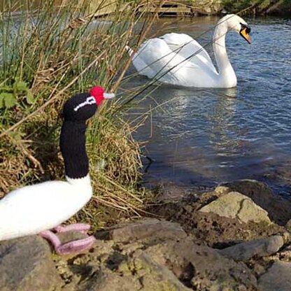 Made up of one knitted piece to form the main body, one knitted piece to form the neck, and one knitted piece to form the beak and head. The legs are each made from a single knitted piece, rolled lengthwise, and four separate small knitted pieces are made to make up the two feet. An additional small knitted piece is used to make the basal knob (small bump at the top of the beak). These knitted pieces are sewn together, and the body, neck, and head are lightly stuffed. Embroidery then adds some finer detail for facial features. Wings are optional.