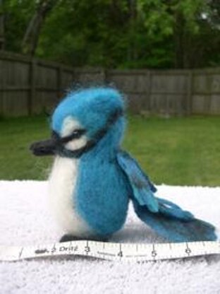 This little blue jay is first knitted in the round on size US 8 double-pointed needles, then felted in your washing machine. After he's been stuffed and dried, wool roving has been needle-felted onto his body. The roving makes details easy! The wings and tail feathers are wet felted pieces, but you could substitute purchased felt, instead. The beak is also wet felted. The pattern booklet includes directions for knitting, felting, needle felting, wet felting and attaching glass eyes. This is a project that is lots of fun! If you've ever wanted to experiment with needle felting or wet felting, this little guy is a perfect place to start. If you have any questions or concerns, please email me.