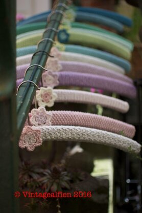 Four different patterns, garter, moss, double moss and reverse stocking stitch, for knitted hanger covers are in this pattern together with a pattern for a crochet flower. It's described in details and with photos