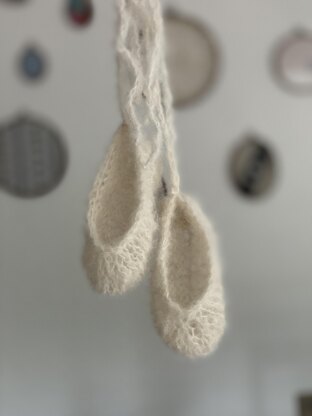 This beautiful and delicate ballerina shoes is made from delicate mohair and is intended to be used as a photography prop. The slippers are worked flat and the sole is sewn on. A simple single crochet stitch is used for the ties.