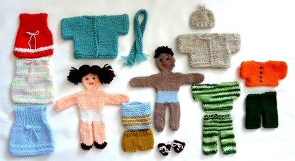 A really different type of paper doll, with all the fun of paper dolls! Knit up the easy shape doll and then add features and hair to be boy or girl. Then knit up many of the clothes styles! Just change colors of yarns, and you have a whole new wardrobe. Clothes slip on and off easily off doll! Small children love these, and they are packable for toting along on vacation! Get started now on a doll and clothes, and dont forget the pajamas! Pants and tops can also be pajamas, dress can also be nightgown! Uses sport weight yarns, knitting needles, US # 5. This also includes patterns for shoes!