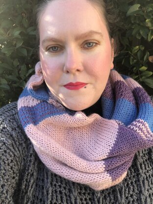This super simple knitted infinity scarf is an ideal project for a beginner knitter or a more experience knitter who is looking for a project with lots of mindless knitting and some rounds with a little concentration needed. Whatever your level you can easily work on this in the evening while watching tv. The skills you need to complete this scarf are the following: cast on, knit, slip stitch, cast off. Dimensions: 38x15 inches You Will Need: 6.5mm circular knitting needles (I used my 16 inch/40cm needles) DK yarn (I used a 70% acrylic, 30% wool blend – the meters per skein are 276) You need three colours, C1 Pink (221m), C2 Blue (166m), C3 Purple (111m) Scissors Tape Measure Tapestry Needles Stitch Marker A gauge is included in the pattern.