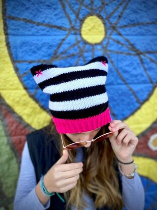 The Knitten Kittenz Beanie is a simple knit hat with a unique shape and bold stripes. Choose 2 contrasting colors with a bold pop of color for the brim as shown, or as many colors as you like. Mixing different striped colors for a scrappy look is a great way to use up yarn from your stash!