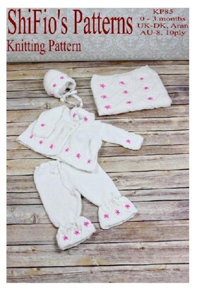 **UK Materials:**Matinee coat, hat and bootees - 250g double knitting wool Knitting needles 3 ¾ mm and 3 ¼, oddment for flowers, 1 cable needle, sewing needle Blanket - 200 grams aran wool, oddment for the flowers, Knitting needles 5 ½ mm