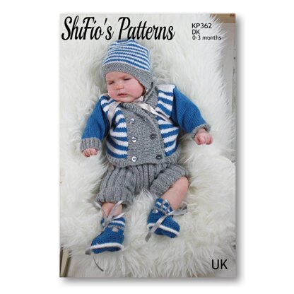 Such a sweet little boys set, with a double breasted cardigan, helmet, ribbed shorts and booties.