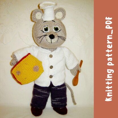 Knitting Pattern – Mouse Chef Toy Soft Toy with Clothes and Cheese – Intermediate Level DIY Tutorial