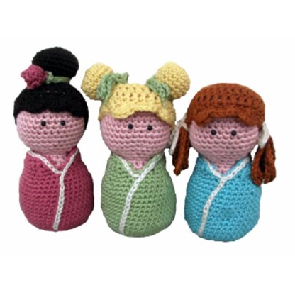 These adorable little dolls are inspired by traditionally wooden Japanese kokeshi dolls. They have no arms or legs, in keeping with the style, and feature removable kimonos.