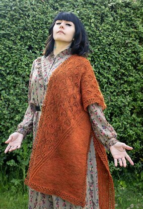 Komorebi features and all over intricate lace pattern with a mesh border and a triangle of stockinette. It wouldn’t be a Stitchin Witch design without something unexpected and a little strange, so there are also some lateral braids and traveling cables.