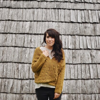 The cardigan is worked in two parts: the bottom part first which consists of the beautiful bobble, lace and cable portion, that is knit flat like a scarf. Then stitched are picked up to knit the back and the sleeves. The sides are seamed to create the opening for the armhole, then both sleeves are knit in the round.