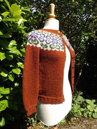 This is a cardigan knitted back and forth from the bottom edge and up with a round yoke and a nice feminin rib pattern at the bottom of the body and sleeves. The yoke has a very nice 4 colored pattern worked in stranded knitting inspired by traditional Scandinavian knitting patterns. This pattern is made for at yarn with a gauge of 22 stitches per 10 centimeters. (Pictured in HIFA ASK II)
