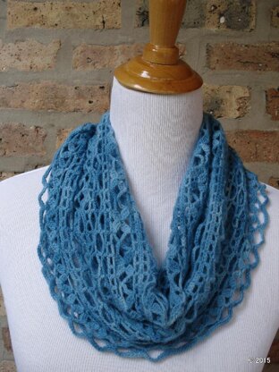 Kotobuki combines traditional filet crochet with triple crochet petals in a lacy, open pattern. The infinity scarf is intended to be wrapped around the neck twice. The wider version was designed to work through the color progression in a single ball of Freia Ombre Lace. The design works equally well with a single-colored yarn or a combination of laceweight leftovers.
