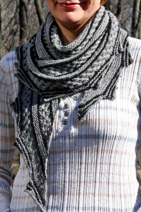 This shawl is knitted from the top down. Rotation of the garter stitch with lace and striped scallops on the edges of the shawl give some charm, Disproportional increase makes the general pattern asymmetric, but the same time the shawl itself is a half-circle. It could be smaller or larger, depends how many repeats would be made. The gauge is not crucial, yarn and needles could be chosen to the taste of the knitter. The stripes could be optional - plain solid color or variegated yarns could be used for this pattern to make a nice light shawl for cool summer evenings.