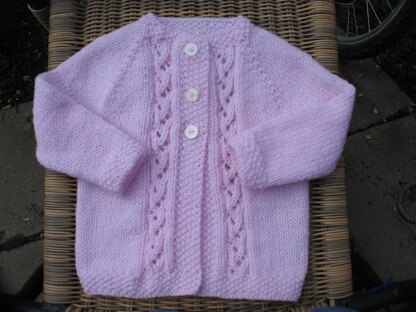 This cardigan is knit top down, with the body worked back and forth in rows and the sleeves worked in the round. Both a chart and written out instructions are included for the lace panel on each front.
