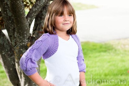 This lightweight shrug is perfect for all year round; wear it over a favorite sundress in the cool summer evenings, or simply over a favorite top on the way to school or kindergarten. The shrug is worked as a modified top down raglan, features ¾ bell sleeves with optional striking cable work.
