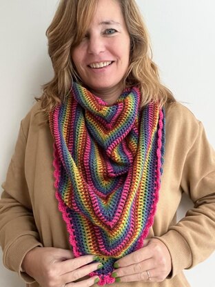 You’ll start the La la love you crochet shawl with a magic ring and will form two sides increasing on both sides until you’re ready to make the border. This way you can let the triangle grow as big as you like. The measurements of my finished shawl are 164 x 80 cm. The border consists of three layers of lovely shell stitches. The pattern is suitable for even an absolute beginner. I’ve made a photo tutorial to make it even easier and remember YouTube and Google are your friends. You will have some ends to weave in though! I chose to change colour every row, but you can easily change the look of this scarf by playing with colours. What about making a unicoloured one? I included my colour scheme in the pattern!