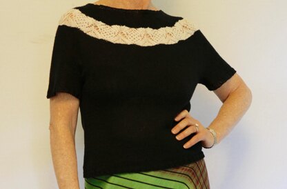 La Masque is a lightweight summer top using a lace weight linen/silk blend, combining stocking stitch and lace techniques to create a beautiful and elegant yoke panel.