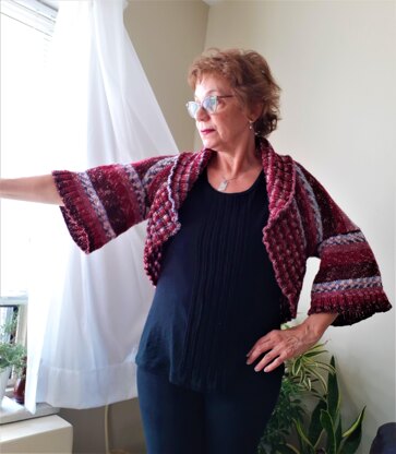 The La Plume Bolero Shrug has a shawl collar and 3/4 inch sleeves with a lovely wide band that resembles a ruffle. It is featured in a color-changing yarn, but made in a solid color would be beautiful as well. The yarn used is a warm, DK worsted weight acrylic/cotton blend. There are endless styling possibilities to go with La Plume. This pattern does not have any seams and includes 4 sizes: S - XL. US 7 circular needles and double pointed needles are used.