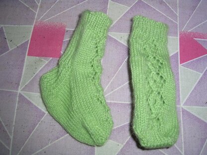 Pattern should fit 4 weeks to about 5 months though it will be a touch large on the 4 week olds. Next size up can be achieved by using a larger needle and increasing the length of the foot slightly. 28.06.10 a larger size again has been added for about 12-15 months. Length is easily customizable so should fit a larger size range.