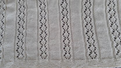 Beautiful soft blanket, available in 3 sizes, knitted with a garter stitch border and lace and stocking stitch rib panels.