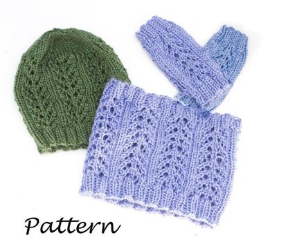 Three patterns for a matching lace hat, neck warmer and fingerless gloves.