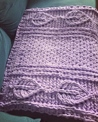 THIS IS A LOOP YARN FINGER KNITTING PATTERN. The Lace Leaf Baby Blanket has a centre section of seed stitches, with a 'woven' border and ribbing, and a border of repeating lace leaf designs. NOTE: While this pattern is written for Red Heart Loop-It yarn, UK knitters can substitute Lion Brand Off The Hook Yarn for a blanket of approximately the same size.