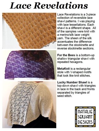 Lace Revelations contains a total of 3 reversible lace shawl patterns with tessellated lace. These patterns are shown off to their best advantage with a shiny yarn, which is why I chose Fyberspates Scrumptious Lace (50% merino/50% silk). Each of the patterns can be changed in size by varying the amount of yarn used or the weight of yarn used.