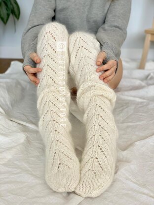 Pattern in English, US knitting terms Skills: knit, purl I used circular needles 80 cm long. But you can easily adapt it to set 4 Double Pointed Needles Pattern include with more yarn suggestions. You can use any yarn close to parameters The pattern includes step-by-step instructions, video tutorials for each step, and a lace pattern chart. The pattern includes four sizes. All sizes and the number of skeins are written in the table with measurements of thigh, calf, ankle, foot. Picture size S-M / Model size XS-S Easy to adjust foot length to fit your size. This pattern includes video demonstration of the pattern. There are no spoken words in the video, and the directions are all shown in captions.