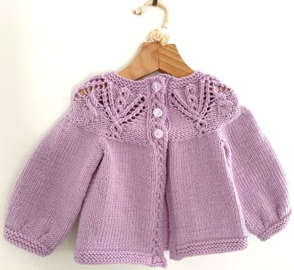 The Lace Yoke Cardigan is a pretty top-down baby cardigan with a delicate Japanese lace yoke and feminine blousy sleeves. It is knitted in one piece from the top down with integrated bands, so no seaming is required. The buttonholes are part of the lace pattern in the front right band, so the number and positions of buttons can be customised and decided on completion.