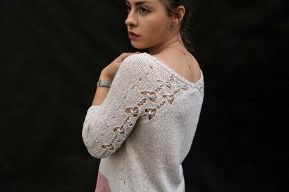 “Laceback Motyle” is a loose–fitting sweater with a wide neckline and ¾-length sleeves, ideal for transitioning into fall. As with my previous design, “Laceback Top”, this one also features elegant lace panels that decorate the back and extend onto both sleeves. However, this time, I used a butterfly-shaped lace pattern – thus the name “Laceback Motyle” (Motyle – Polish for butterflies).