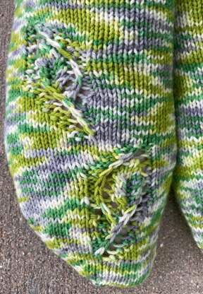 Stylized leaves float down from the pretty picot hem, perhaps lackadaisically, to show off a dramatic variegated yarn.