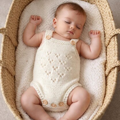 Quick to knit with a simple lace detail. Just lovely for your own baby for everyday wear or as a special gift for a baby shower. Sleeveless bodysuit style with buttons in the gusset for easy diaper changes. Buttons on the shoulder straps are optional, you can leave them off, or make ribbon-ties The pattern includes instructions for a romper 0-6 months AND a simple bonnet for sizes Newborn to 6 months old Quick and fun to make.