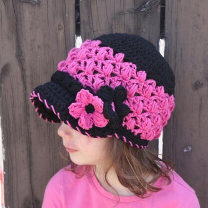 This lacy newsboy hat is very pretty. It can be made in a solid colour, or with 2 different colours. The contrasting trim and flower really finish off the hat.