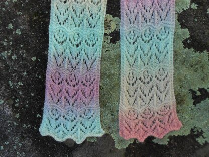 Here is a lovely scarf knitted with color changing yarn. It features a gentle ripple stitch, and lace. It can be knitted quickly and would look great in any color or weight yarn!