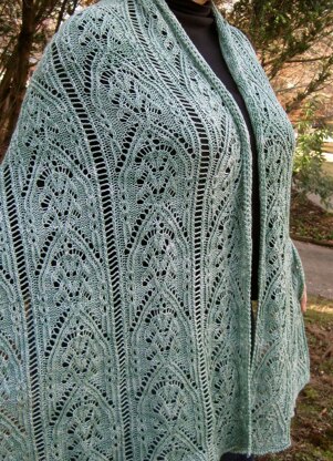 This shawl features a lace and mock cable stitch which comes to us from Japan, and is accentuated with a Japanese ladder stitch. All symbols have been translated from Japanese to the symbols that are familiar to Western knitters. Combined, they make a unique and delicate shawl.
