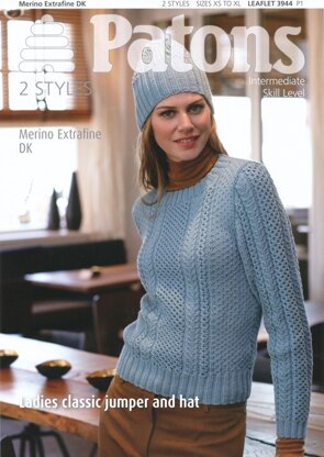Ladies Classic Jumper and Hat in Patons Merino Extrafine DK - 3944 is a Knitting pattern by Patons, available as a Leaflet and includes instructions in English. Super fun to make, this pattern could be your next masterpiece!