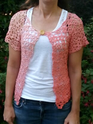 This pretty ladies cardigan, in shorter length, is made from crocheted flower motifs.  Some flowers have solid petals, some open petals. A random mix of open and closed flowers are made individually and joined together as you work.