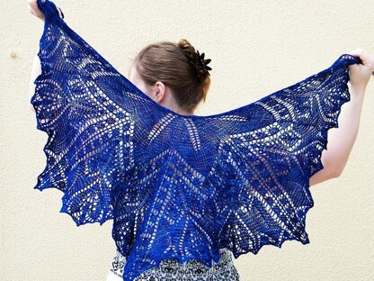 Instructions for the triangular small shawl (shown in gold) and crescent/nearly-square shawl (shown in blue) are included. Includes both fully charted and fully written instructions.
