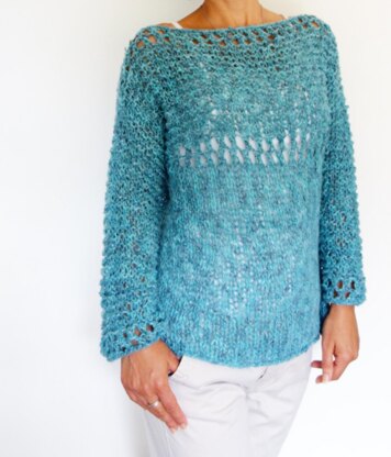 This charming and light sweater is perfect for vacation. Be prepared for the breeze with this gorgeously textured, off-the-shoulder sweater. A simple pattern framed by open knit rows is worked around the upper body and sleeves. It knits up in a flash, using chunky yarn on big needles.