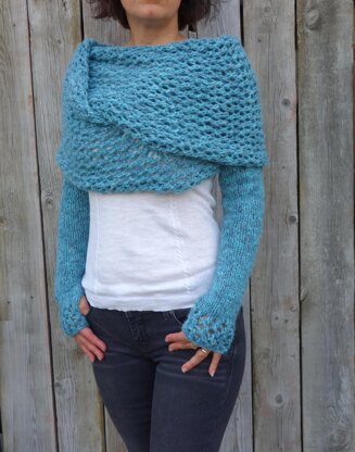 This intricate and versatile chunky wrap around shrug is warm and comfortable, the perfect accessory for any occasion. It can be a wedding wrap, paired with a casual outfit or with a sexy pair of jeans, and it converts easy into a winter scarf. Features a chunky lace wrap part and lean stockinette stitch on sleeves which end with a a lace edge and unexpected thumbs holes for added interest.