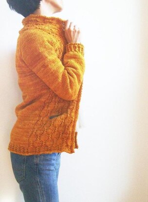 This cardigan starts off at the centre back of the collar. Stitches are picked up for the sleeves and the back, and worked all in one piece seamlessly. The lace on the collar continues to the front neck and gradually increases on the front body. The cables of the lace at the right and left fronts are carefully mirrored.