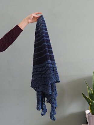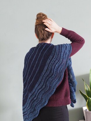 Lakeshore is a gorgeous crescent shaped shawl that’s engaging to knit. The two colors alternate creating a lovely ripple effect, like waves. There’s plenty to keep you interested – stripes, dropped stitches and lace – and together they create a harmonious, gentle wrap.