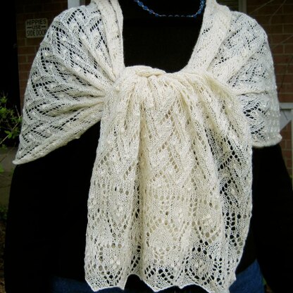 The shawl measures 22 inches x 68 inches, and requires approximately 1250 yards of lace weight yarn.