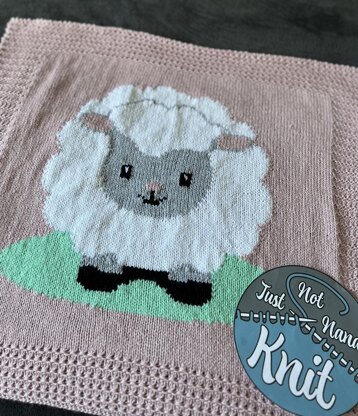 A sweet lamb baby blanket, knitted with a pink background (but could easily change to blue, or lemon).