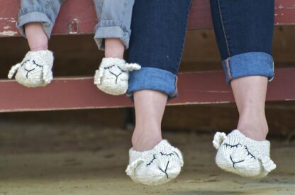 These Lamb Shoes are a twist on the bunny slipper. Knit in one piece and seamed together, they have an embroidered lamb face and an extra layer of cushioning for the sole.