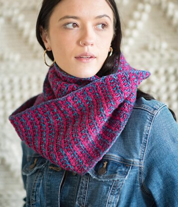 Lambertville is a soft, squishy cowl that can hang long or wrap around your neck for extra warmth. It has a bit of the look of brioche but is really simple. All knits, purls, and slipped stitches over a 4-round repeat. It really shows up contrast between a tweedy yarn and a solid or semi-solid yarn. Go wild with color combinations or pair two closer shades for a subtle look.