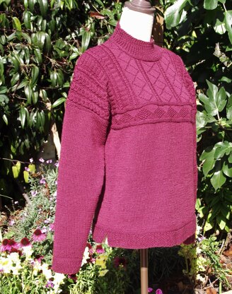 This gorgeous sweater, with the yoke section in traditional gansey style stitchery, has timeless appeal. I named it after the beautiful, tiny fishing cove of Lamorna in South West Cornwall. The fit is straight with most of the patterning on the upper front and back. The sleeves and lower borders are in moss stitch, ending with a slightly raised ridge of reverse stocking stitch, which is also reflected on the yoke neckband. I hope you’ll love this sweater as much I loved designing it.